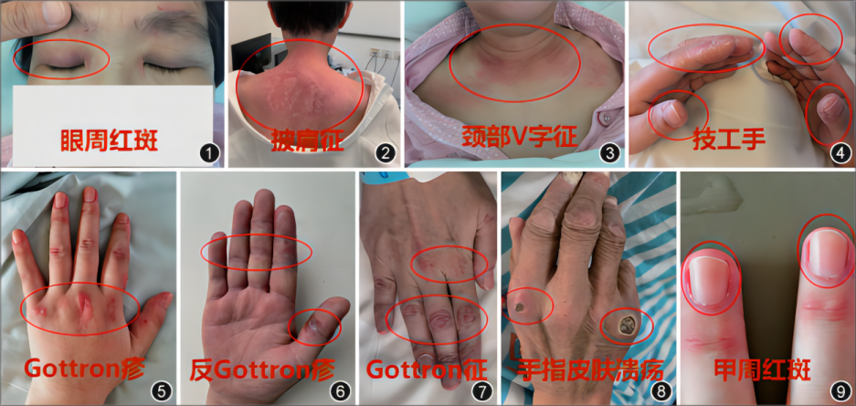特发性炎性肌病患者常有一些特征性皮肤表现,中华结核和呼吸杂志曾在2022年7月第45卷第7期发表“特发性炎性肌病相关间质性肺疾病诊断和治疗中国专家共识”一文,文中为我们提供了9幅典型的特发性炎性肌病特征性皮肤表现图片。