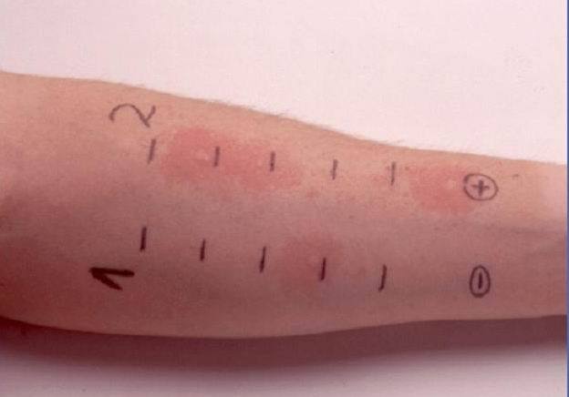 2.血清 IgE 检测:过敏原 sIgE 定量检测具有高特异性和较高敏感性,适用于任何年龄,且不受皮肤条件限制。(下图为皮肤点刺试验)