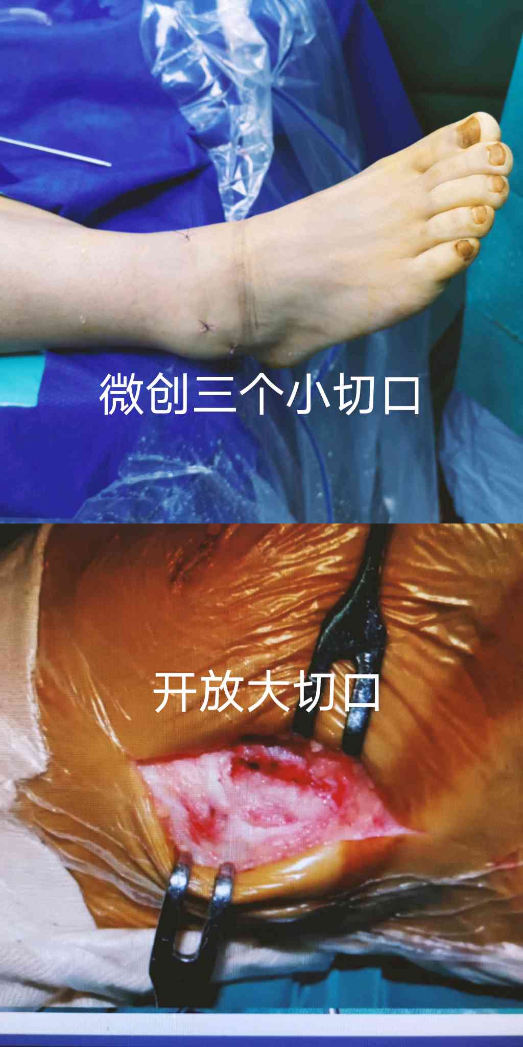 之前开放手术是唯一治疗手段,但开放手术存在创伤大,恢复慢,尤其对于女孩子来说不美观等缺点。近年来随着关节镜技术的发展,微创治疗最来越得到广泛应用及推广。我们科室早在2006年就开始微创关节镜治疗运动损伤,在全国都属于率先开展关节镜微创治疗运动损伤的科室。到目前已取得丰富的临床经验及满意的临床疗效。踝关节以前大切口已经被两到三个小切口所取代,并且同样能够取得优良的临床疗效,而且更加美观,恢复更快。就以踝关节外侧副韧带修补手术为例,如图所示以前大切口,现在三个小切口就好;以前康复石膏固定三周再用支具三周,现在总共只需要支具固定3-4周就可以。随着科学技术的发展,我们一定朝着更加微创,美观的方向发展,我们科室也将继续走在科技,时代发展的前沿,为大家的健康保驾护航!