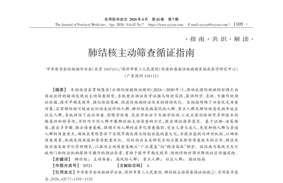 详细内容、新进展和具体落实,可以参见中华医学会结核病分会最新发布的《肺结核主动筛查循证指南》。