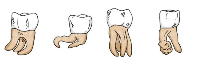 个例牙根弯曲的,在拔除时容易折断,很小块倒没事会被吸收掉,留在里面不用管,如果残留较大就得弄松动去除,不然后期会感染伤口,影响牙槽骨重建。