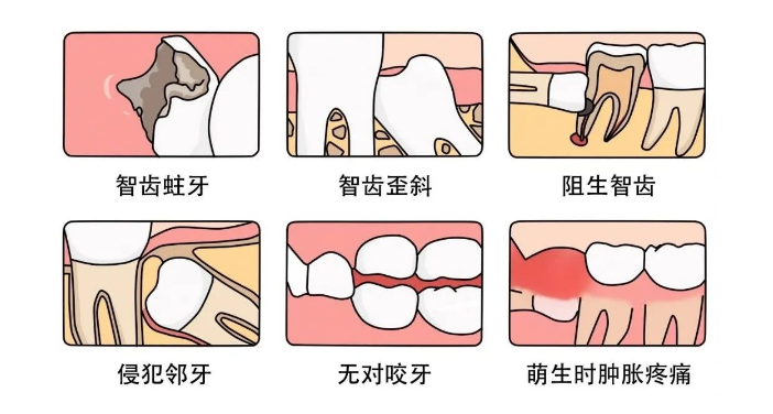 由于空间不足的关系,智齿常长得歪七扭八,因此常造成清洁牙齿的困难,所以致发生蛀牙现象。