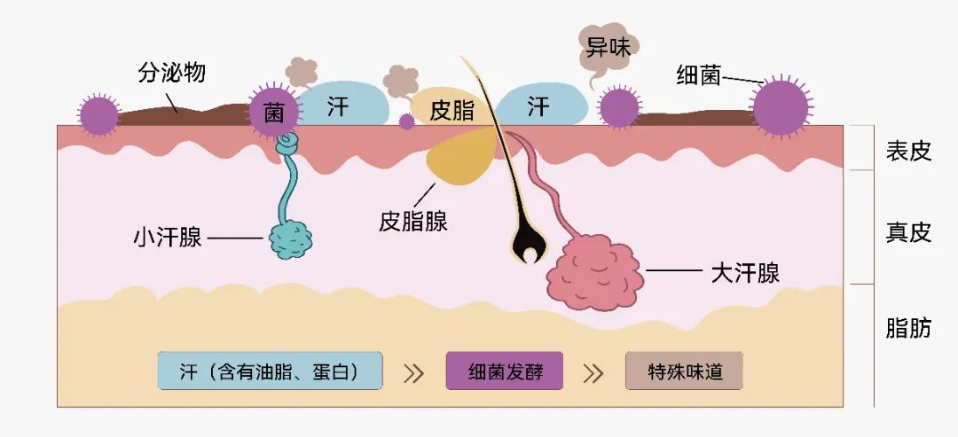 人体汗腺分大汗腺和小汗腺,大汗腺集中在腋下等部位,分泌的汗液本身无味。但当汗液与腋下皮肤表面的细菌相遇,细菌分解汗液中的蛋白质、脂质等成分,生成不饱和脂肪酸,才产生刺鼻的异味——这才是腋臭的真正成因。换句话说,出汗多只是为异味“创造条件”,没有细菌参与,再多汗也不会有腋臭。