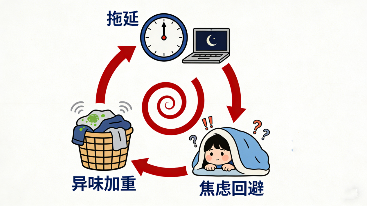 一旦开始拖延,便容易陷入自我加强的循环:拖延 → 异味随青春期加重 → 开学后尴尬凸显 → 产生焦虑与回避心理 → 因羞耻或压力再次拖延应对 → 问题持续加剧!这个循环的核心陷阱在于:最初的拖延,会让解决问题所需的心理成本和实际成本都变得更高。每一次“再等等”,都是在为这个循环增加动力。