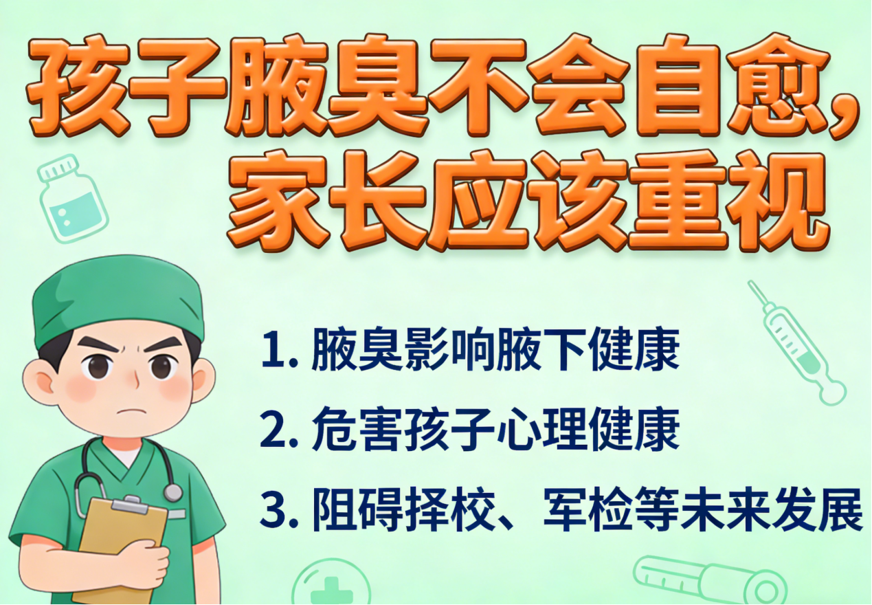 如果通过以上生活方式调整和常规护理,异味仍然非常严重,已经严重影响到孩子的社交与心理健康,家长可以考虑寻求专业医疗帮助。请带孩子前往腋臭专科就诊。医生会进行评估,并提供更专业的治疗方案。