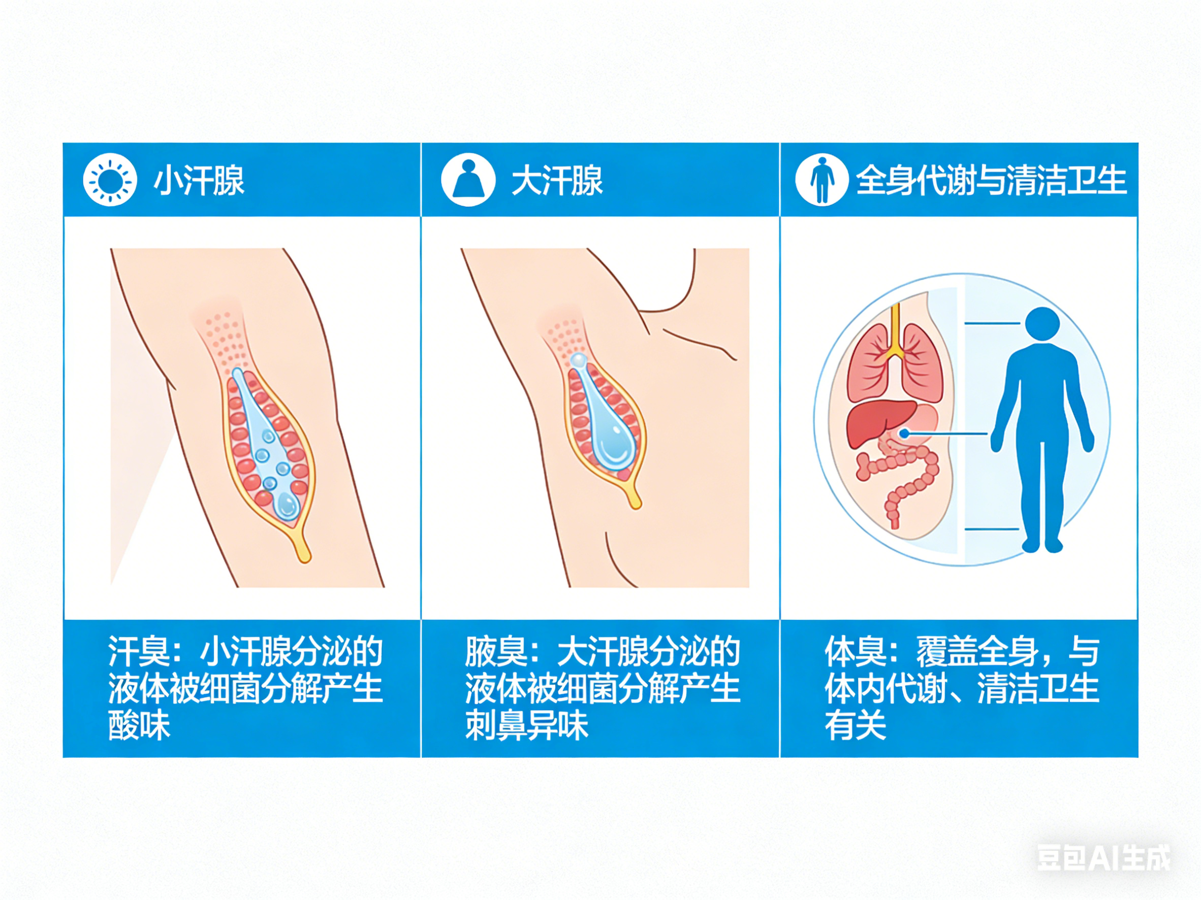 全身性体臭:异味覆盖全身,不止局限于腋下,多和饮食重口、作息紊乱、个人卫生习惯差,或是少数身体代谢问题相关,调整饮食、规律作息、加强全身清洁后,异味会快速缓解,和大汗腺分泌无关。