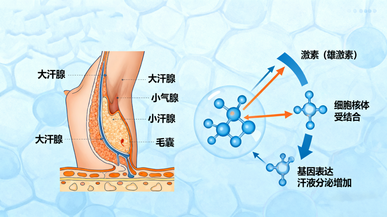 腋臭(狐臭):由腋下大汗腺异常分泌导致,属于遗传性体质问题,并非卫生差。大汗腺分泌物含大量脂肪酸和蛋白质,被细菌分解后产生刺鼻异味,异味浓烈、持久,即使安静少动、清洁后仍会残留,范围集中在腋下,近距离接触时尤为明显,和日常卫生关联度低,青春期激素波动会加重分泌。