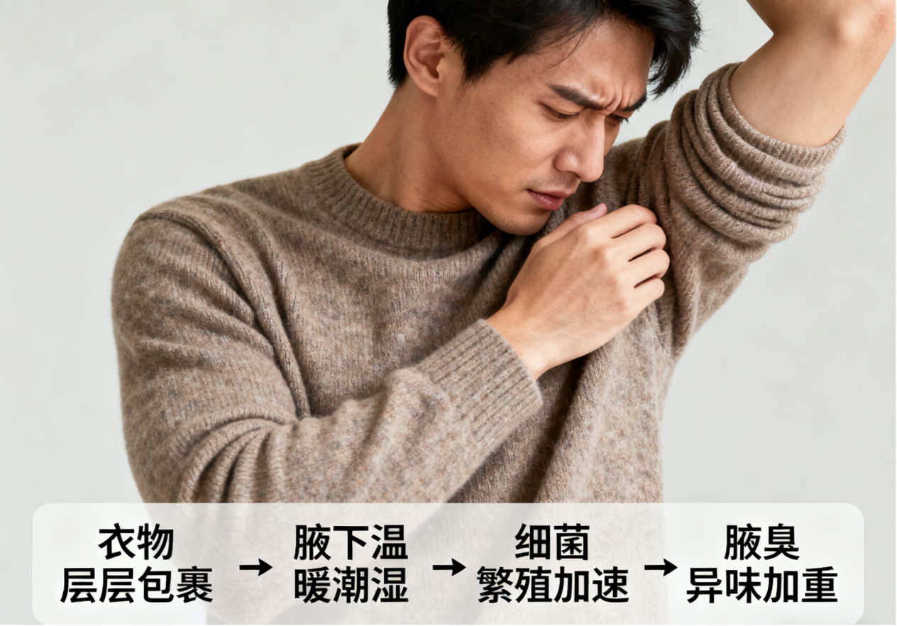 · 高温闷热环境:处于高温、闷热、不通风的环境中,会导致腋下温度升高、湿度增加,这种环境极易滋生分解汗液的细菌。同时,高温会促使身体大量出汗,给细菌提供充足的“养分”,加重异味。