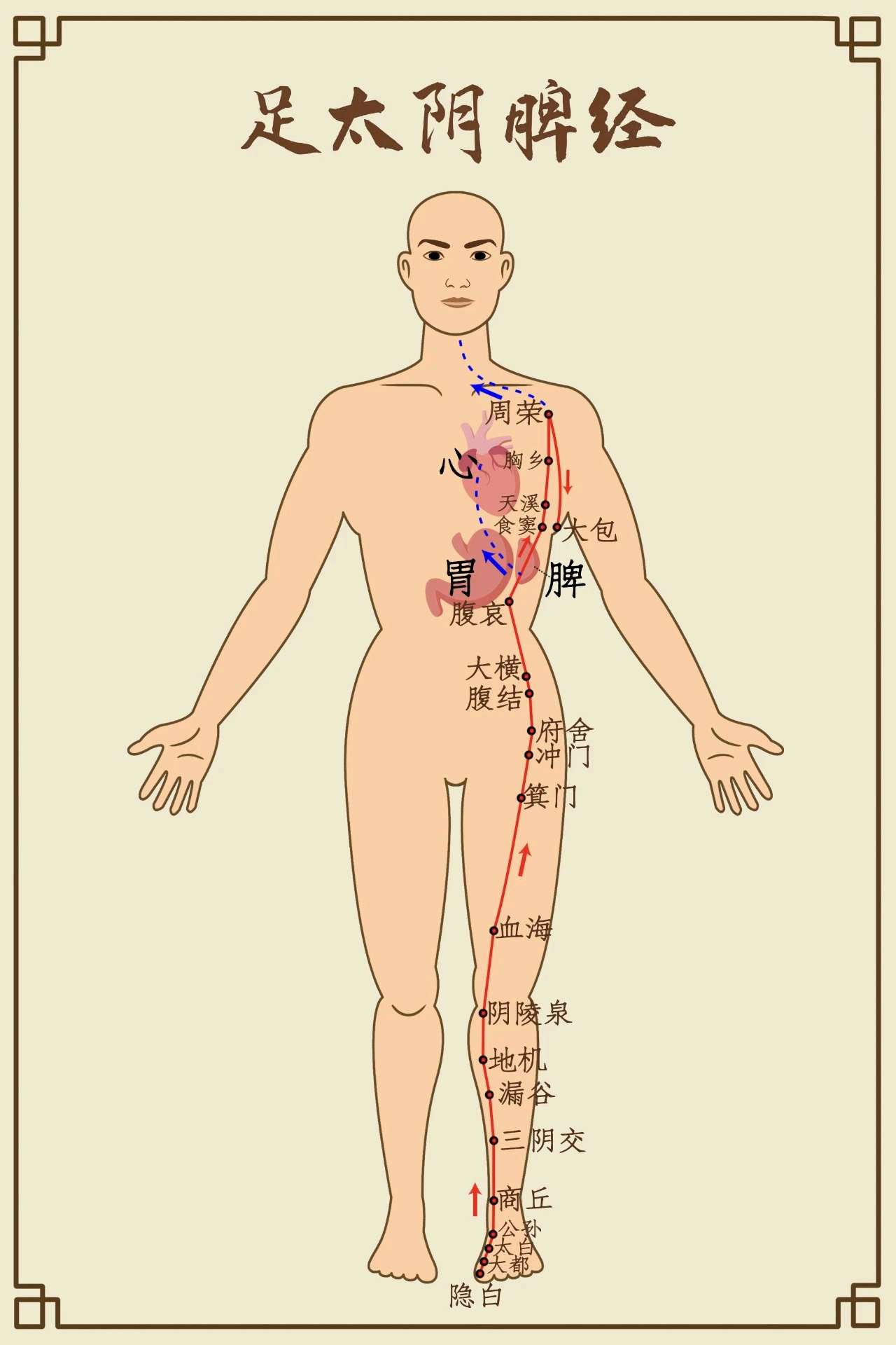 沿足太阴脾经循行路线敲打,从隐白穴至大包穴,配合商阳穴点压,激发三焦经气化功能。