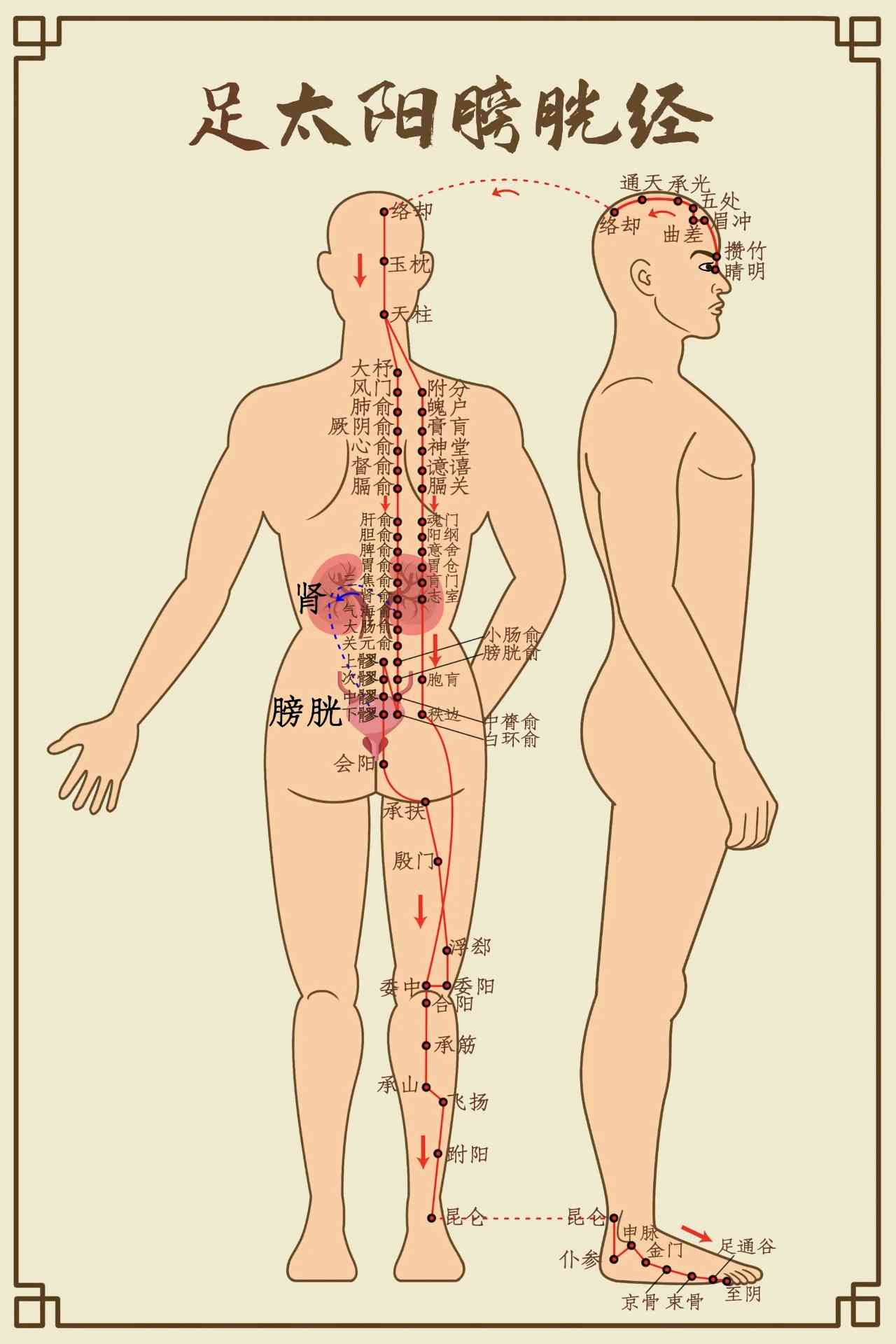 申时(15-17点)膀胱经刮痧,重点施术于承山、委中二穴,助湿邪从太阳经排出。