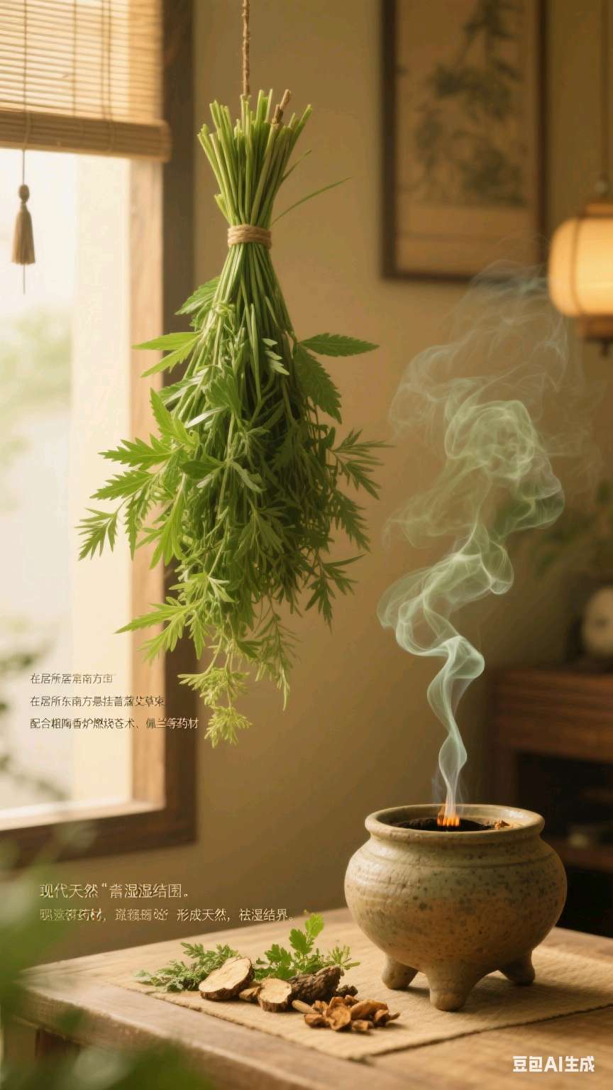 在居所东南方悬挂菖蒲艾草束,配合粗陶香炉燃烧苍术、佩兰等药材,形成天然「祛湿结界」。现代研究证实,此法可使室内真菌浓度下降63%。