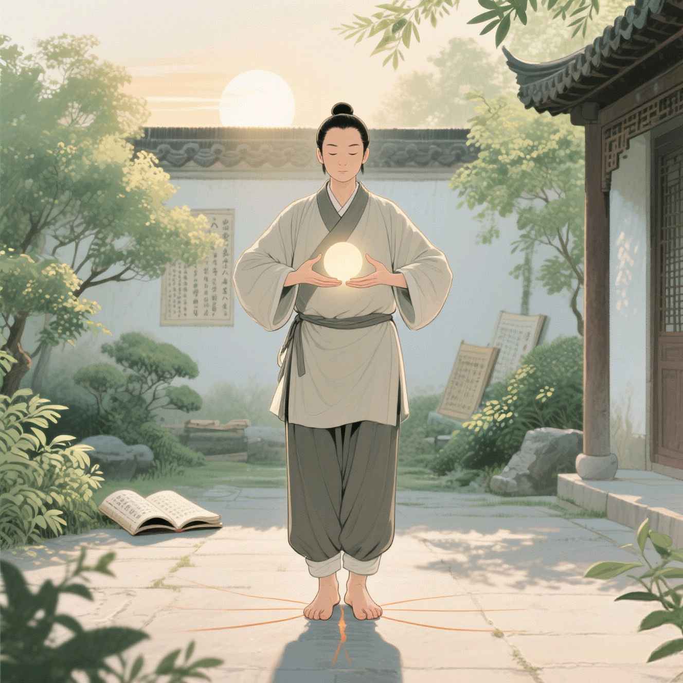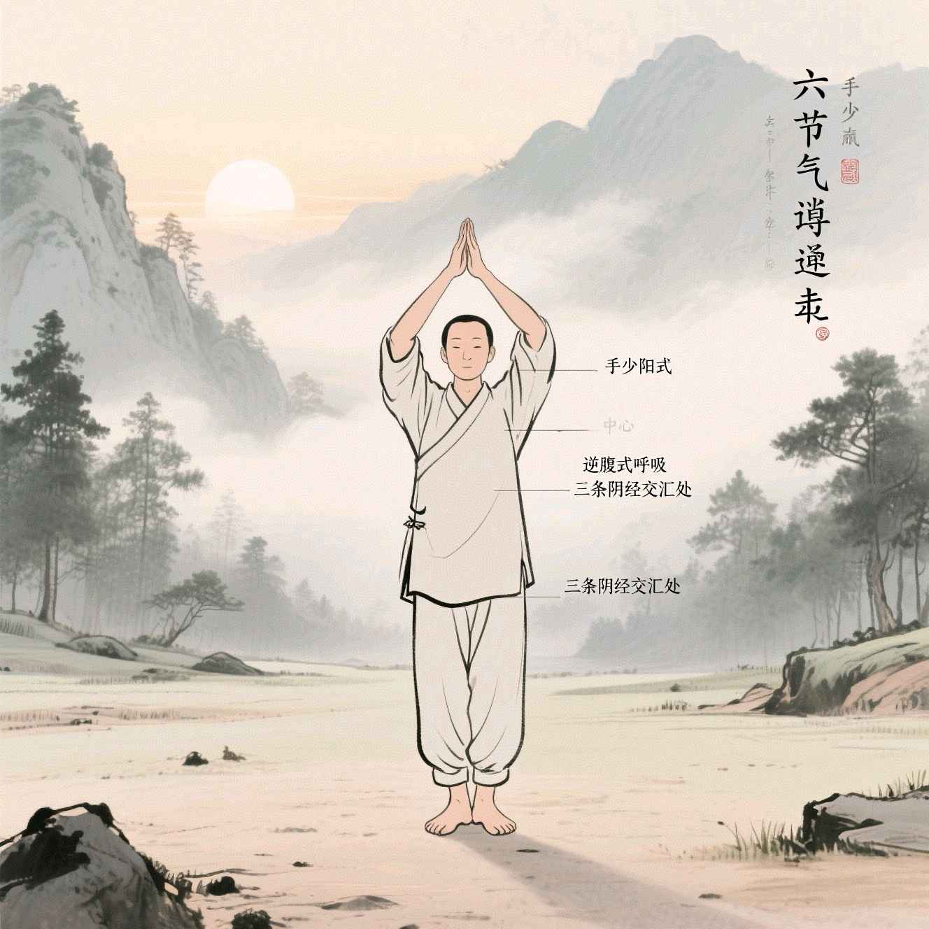 此法传承自《遵生八笺》的「手少阳式」:晨起面东而立,双手如托日月抬至膻中,配合逆腹式呼吸,同时踮起足跟。此动作刺激三条阴经交汇处,符合「冬病夏治」原理。