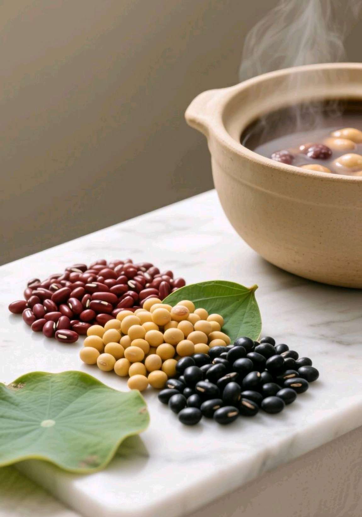 「三豆饮」进阶配方:赤小豆15g、黄豆30g、黑豆30g,佐以新鲜荷叶半张,文火煮至豆开花,取汤代茶饮。