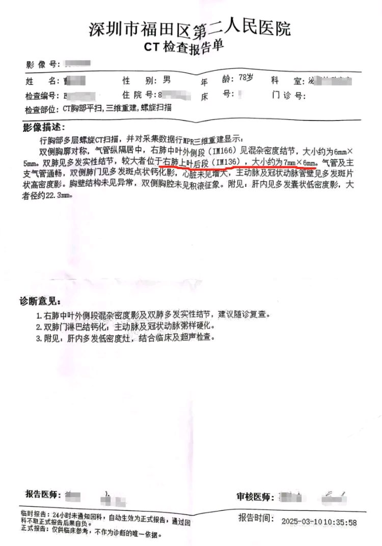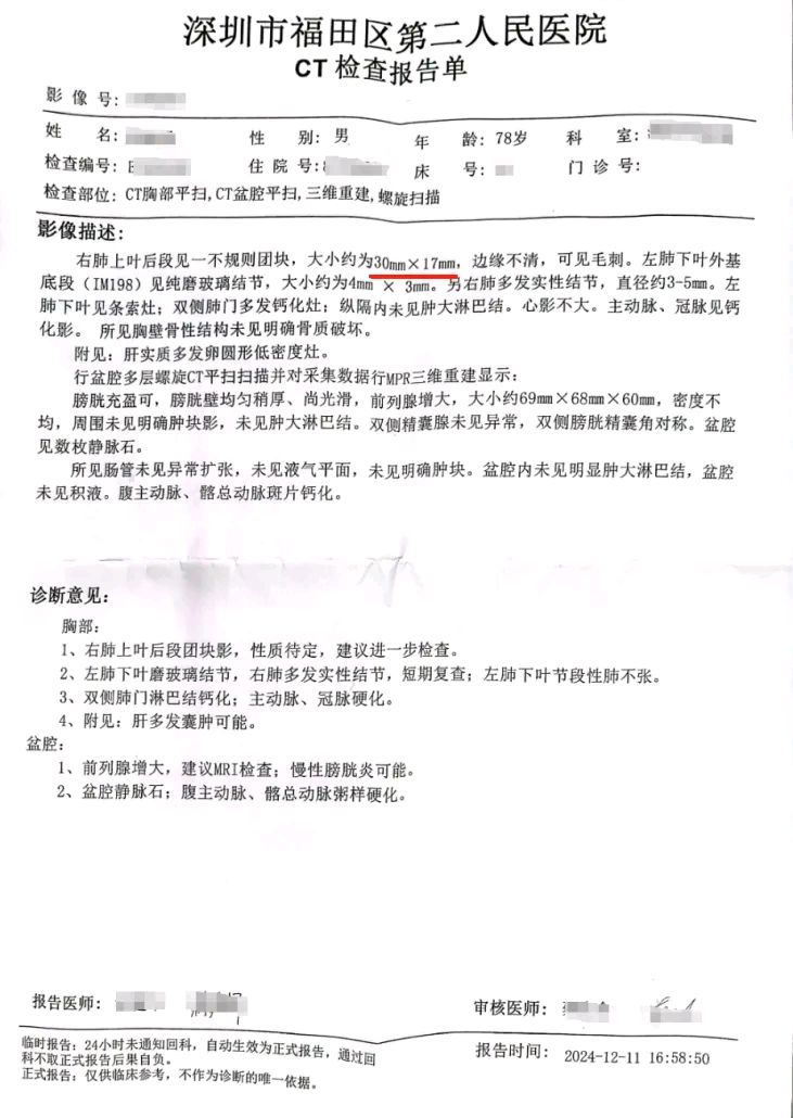 现病史:患者于2024-12-11于深圳市福田区第二人民医院行前列腺手术住院查肺部CT:右肺上叶后段,左肺下叶磨皮璃结节,右肺多发实性结节。
