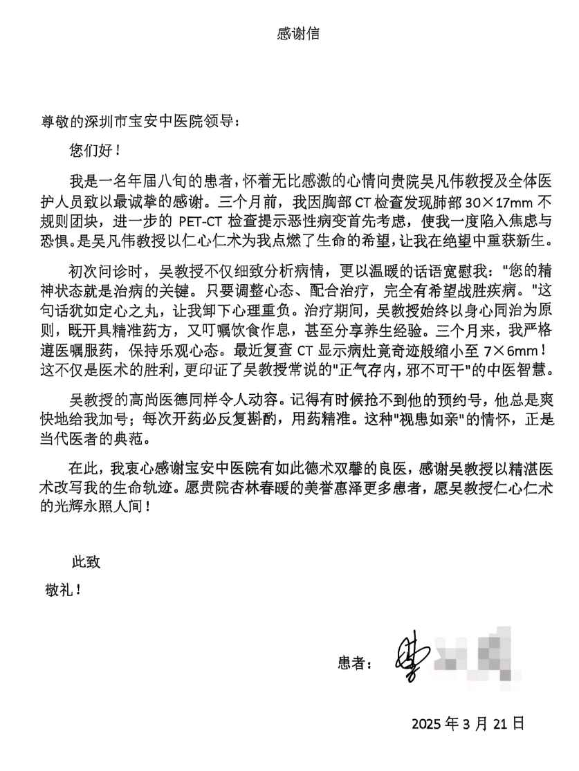 老C在服用协定散结丸三个月后,2025年3月10日在同一家医院复查CT显示:右肺中叶外侧段混杂密度结节6mmX 5mm(明显缩小);双肺见多发实性结节,较大者右肺上叶后段7mmx6mm(左肺下叶磨玻璃结节已消失)。紧接着而来的前列腺切除术,老C顺利过关,主刀医生惊叹他术中出血少、术后康复快,不亚于青年小伙的康复速度。