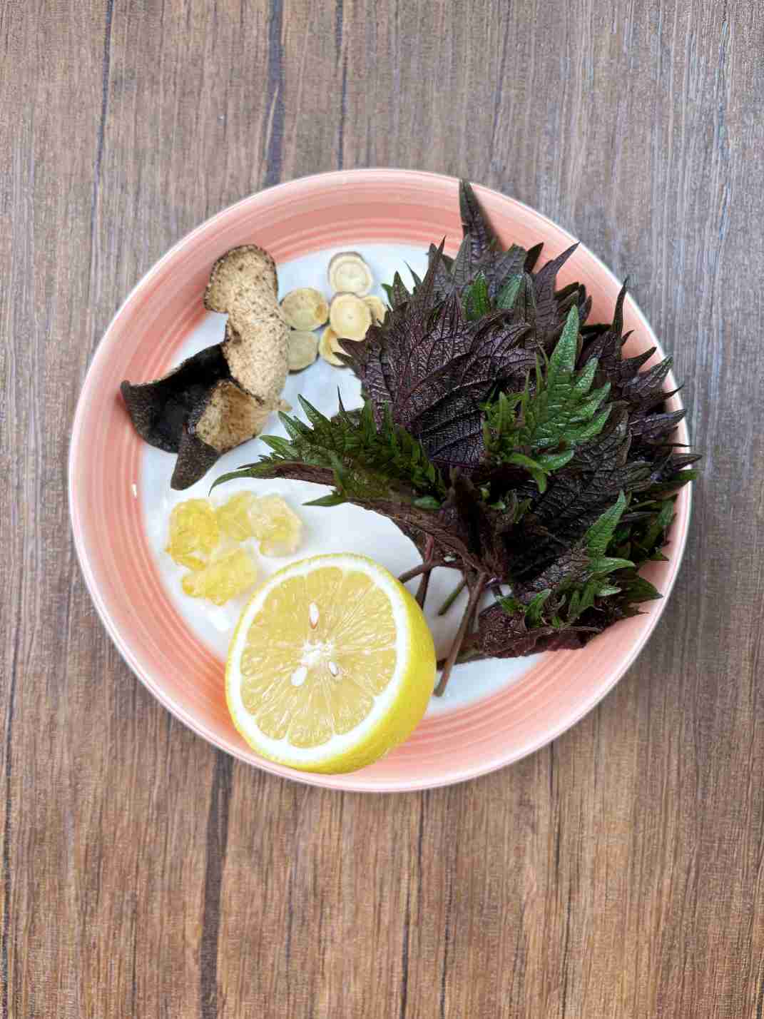 - 紫苏叶15克、生姜10克、陈皮5克、甘草5克,煮沸10分钟,可加少许冰糖或蜂蜜调味。