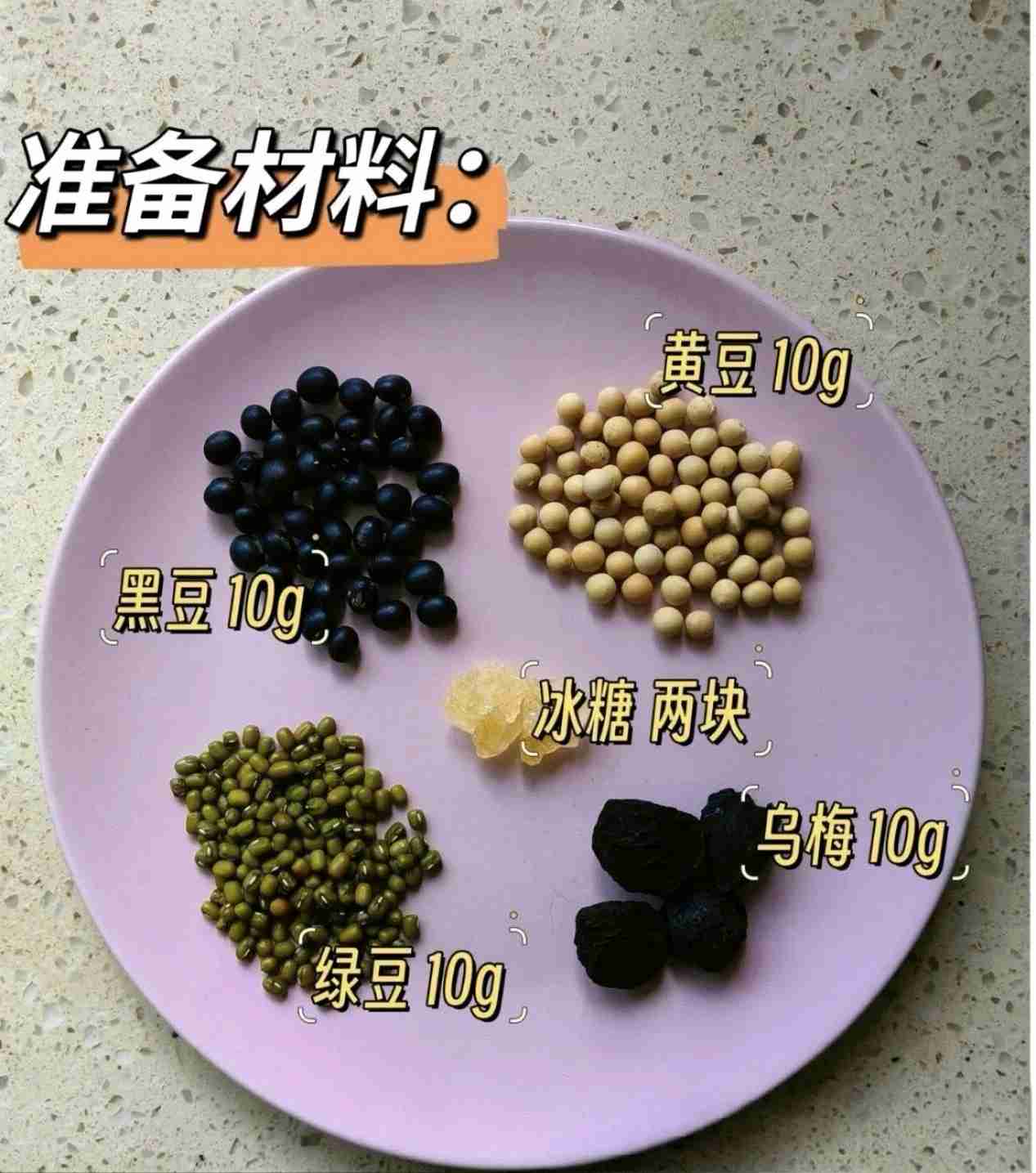 - 乌梅5颗、绿豆30克、黑豆30克、黄豆30克,煮至豆烂,加冰糖调味。