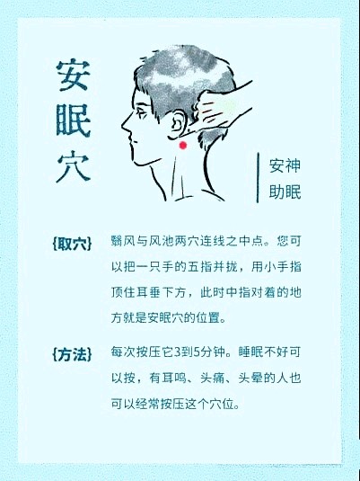 睡前先点按穴位一分钟,再旋转按揉安眠穴3-5分钟,按揉时力度要适中,每天午睡、夜卧前各1次。