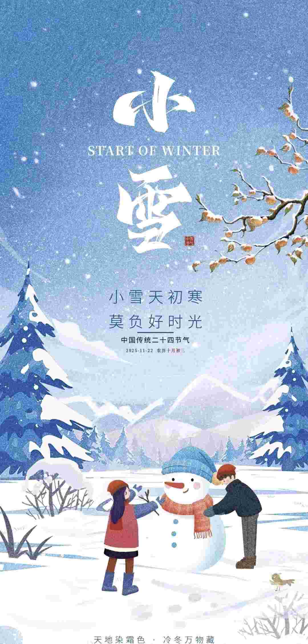 "小雪封地,大雪封河":此言小雪时土壤开始冻结,至大雪时节河水结冰,提示我们气温持续走低,需注意防寒保暖。