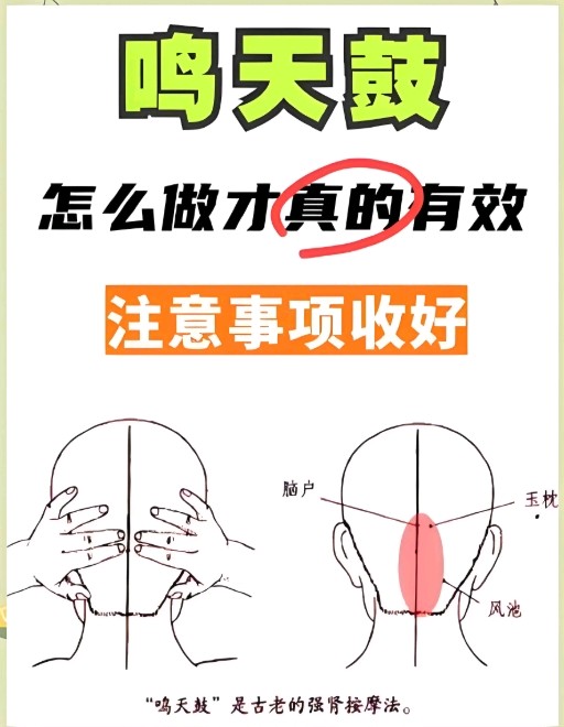 双手掌心紧按耳孔,手指放于脑后,用食指压中指弹击后脑24次。然后手掌连续开合9次使耳廓振动。此法能激发肾气,聪耳健脑,改善因肾气不足引起的耳鸣头晕。