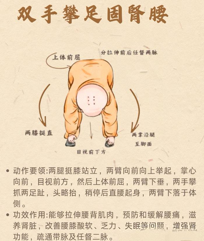 站立,两手伸直上举,随后缓缓弯腰,双手下按至足背,稍停后缓慢起身。重复8次。此式能刺激肾经、膀胱经,增强腰部及肾功能,符合冬季养肾之道。