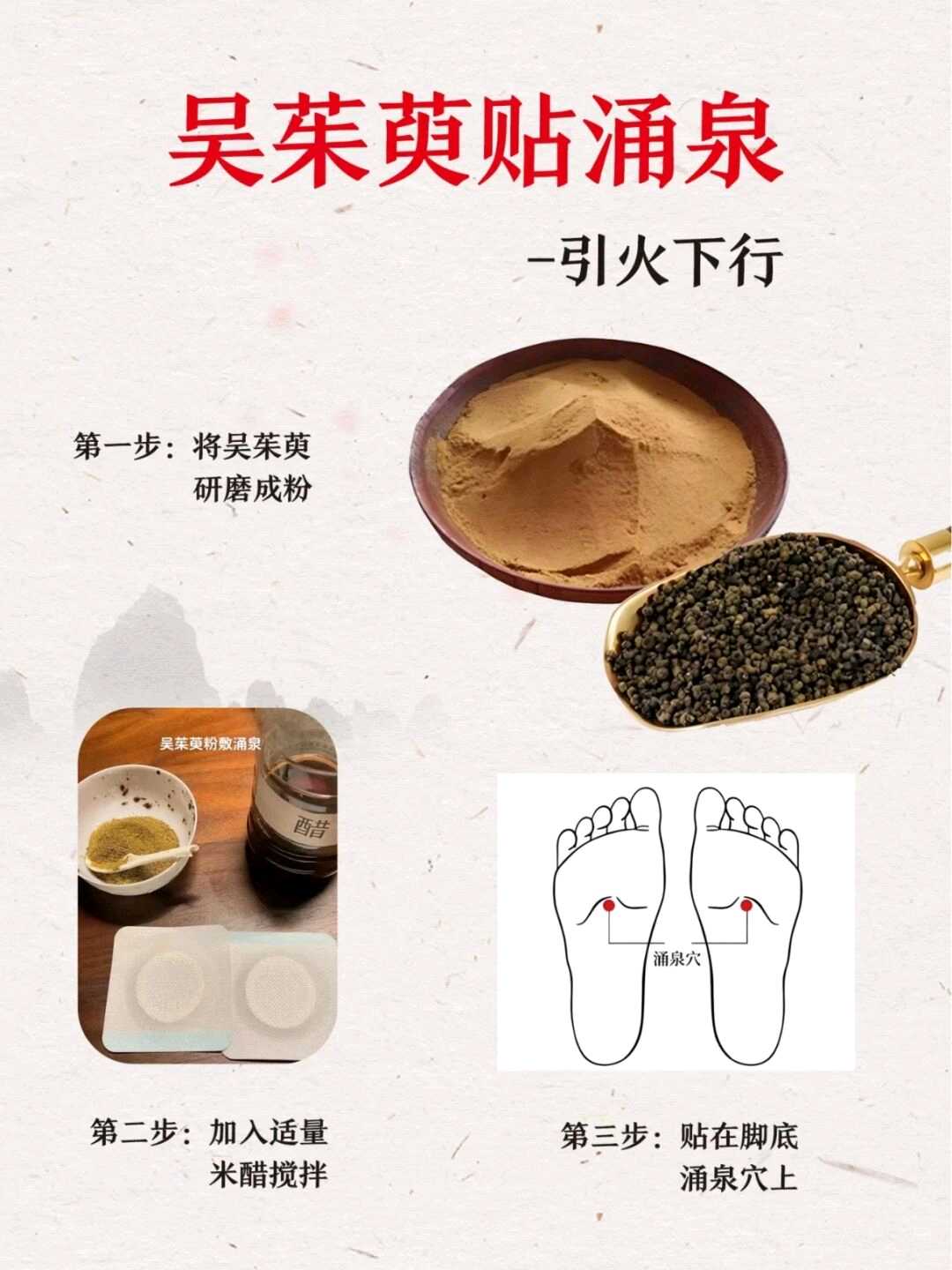 ②贴敷:吴茱萸粉贴涌泉穴,引火归元。