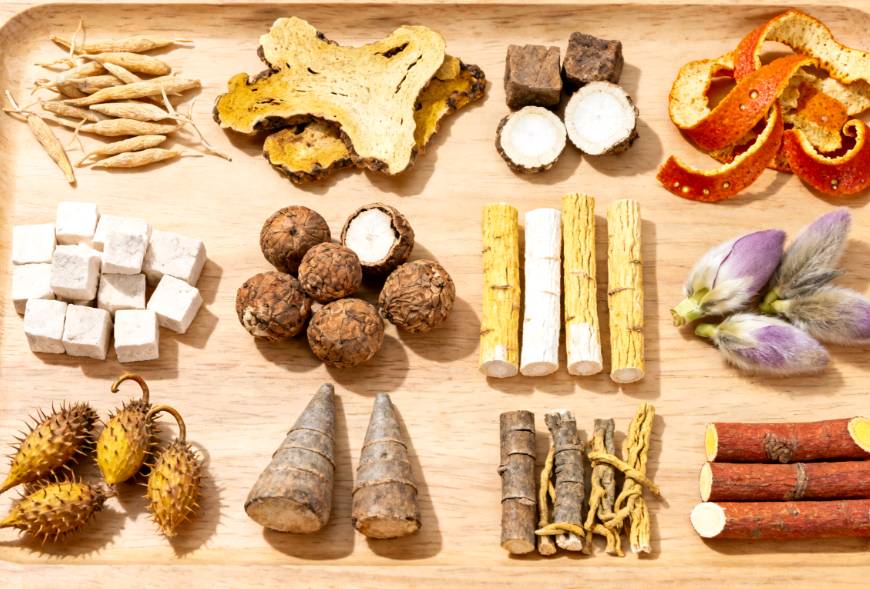 秦老让阿明取来四味药材,在柜台上依次排开: