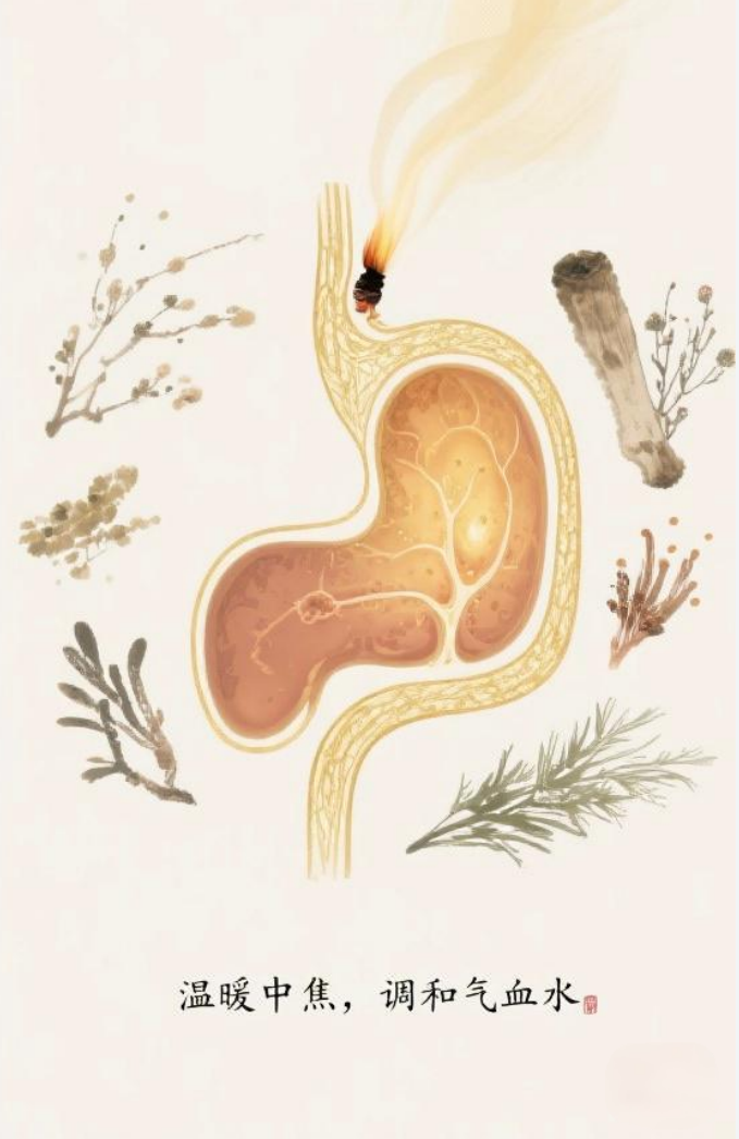用温热药物(理中汤+黄芪)直接补充脾阳,强壮脾胃功能,好比给熄灭的炉灶重新点火。这是解决所有问题的根基,体现“治病必求于本”的中医思想。