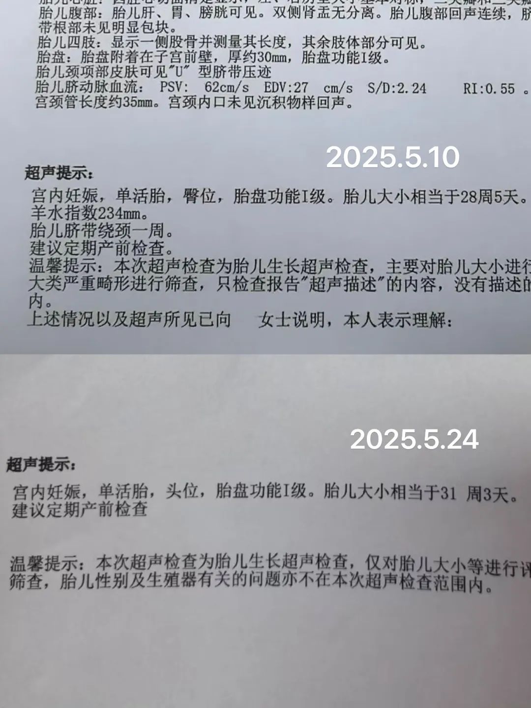 孕28周2025.5.10上午做了B超提示臀位,下午来门诊做了双侧至阴穴麦粒灸各五壮+胸膝卧位15分钟。2025.5.24复查为头位。