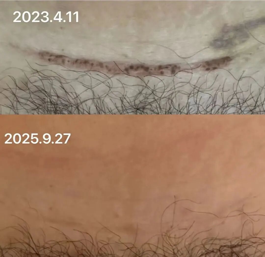 而治疗后的疤痕除了两边平了,整体的颜色变淡了,原本疤痕上的色素沉着了都祛除了。