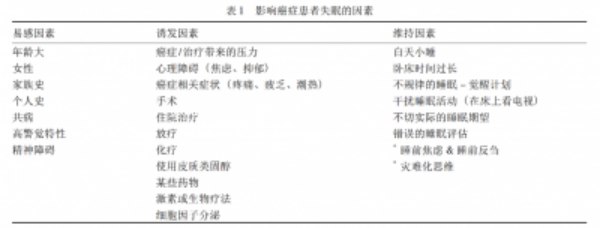 造成肿瘤患者睡眠障碍发生的因素是多方面的,可将其分为三大类,分别是:包括年龄、性别、心理素质、睡眠史等在内的风险因素;包括癌症类型、分期、癌痛、用药、治疗等的诱发因素;包括白天睡眠、作息不规律等的持续因素。
