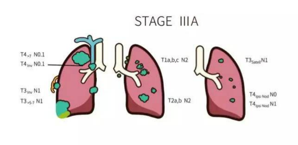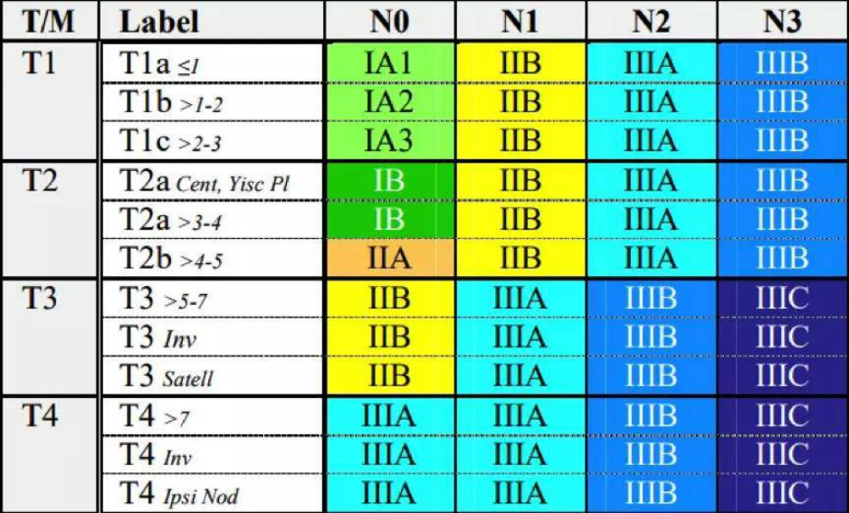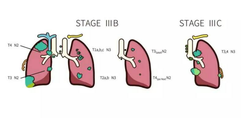 相对来说,IIIB和IIIC的判断就简单一些,IIIB期变成了T1-2N3和T3-4N2两大类,在第8版中首次被单独分出的IIIC期则只有T3-4N3一类,它的预后实际上与IVA期患者差异不大,也说明了病情的严重程度。