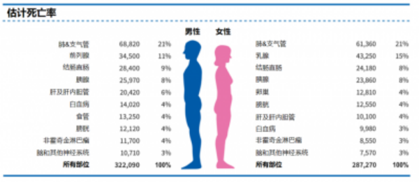 以美国为例,下图描绘了2022年男性和女性中诊断出的最常见的癌症及死亡率最高的十大癌症类型。前列腺癌、肺癌和支气管癌(以下简称肺癌)以及结肠直肠癌(CRC)占男性所有发病病例的近一半(48%),仅前列腺癌就占诊断的27%。对于女性,乳腺癌、肺癌和CRC占所有新诊断的51%,仅乳腺癌就占近三分之一。死亡人数最多的则是男性的肺癌、前列腺癌和结肠直肠癌以及女性的肺癌、乳腺癌和结肠直肠癌。