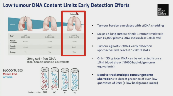 Swanton教授表示:“虽然ctDNA有很好的应用前景,但其检测难度限制了其发挥。”从10ml血液样本中只能提取约30ng的总DNA量(约相当于9000个单倍体基因组)。1B期肺癌每10,000个血浆DNA分子中,仅仅脱落1个突变分子,其变异等位基因频率(VAF)为0.01%,非特异性肿瘤ctDNA早期检测方法的VAF在0.1-0.01%之间,均无异于大海捞针。因此,需要追踪多个肿瘤基因组异常来检测这种低量DNA的存在。