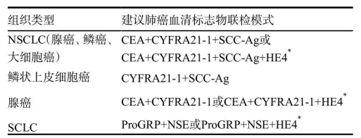 CEA+CYFRA21-1二联检对NSCLC特别是肺腺癌有较高的诊断价值。CEA+CYFRA21-1+HE4三联检进一步提高组织特异性、阳性预测值和阴性预测值;