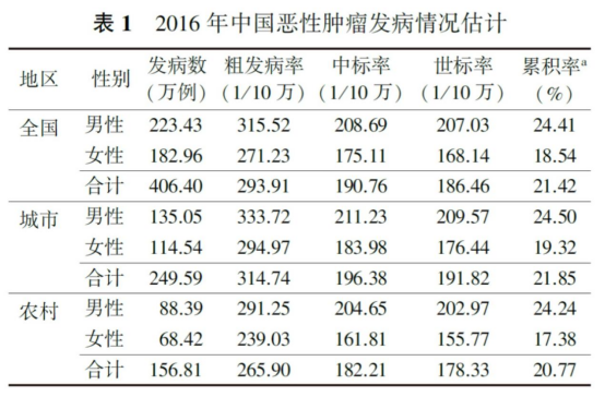 2016年新发癌症406.40万例,死亡241.35万例。0-74岁累积发病率和死亡率为21.42%和11.85%。