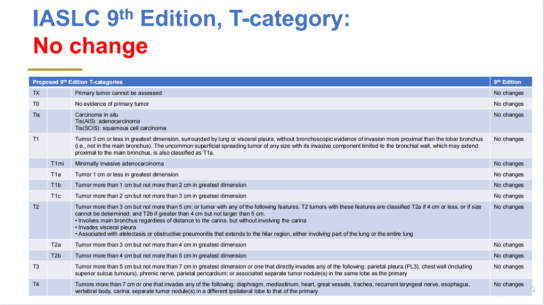 T1N1 由第 8 版的ⅡB 期调整为ⅡA 期,T1N2 由第 8 版的ⅢA 期细分为了 T1N2a 对应ⅡB 期、T1N2b 对应ⅢA 期。总体而言,第九版 T 分期无变化,N、M 分期有进一步细分。