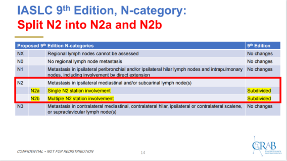第九版将 N2(同侧纵隔和/或隆突下淋巴结转移,受累淋巴结已达中央区域,即 1-9 站)细分为 N2a(单站淋巴结受累)和 N2b(多站淋巴结受累)。同时 N2a 与 N2b 临床以及病理分期的预后均有显著差异。