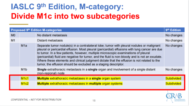 第九版 TNM 分期将 M1c 细分为 M1c1 和 M1c2——M1c1(单个器官系统中多发胸外转移)和 M1c2(多器官系统的胸外多发转移)。
