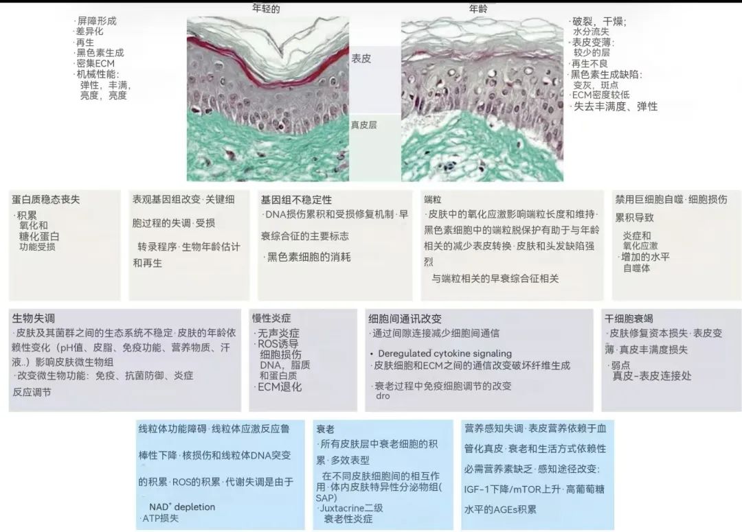 皮肤衰老是生物衰老过程的一个重要组成部分,其标志包括结构变化(如皱纹、松弛、色素沉着不均等)和功能变化(如屏障功能下降、免疫功能减弱等)。这些变化不仅影响皮肤健康,还与全身性健康问题密切相关。