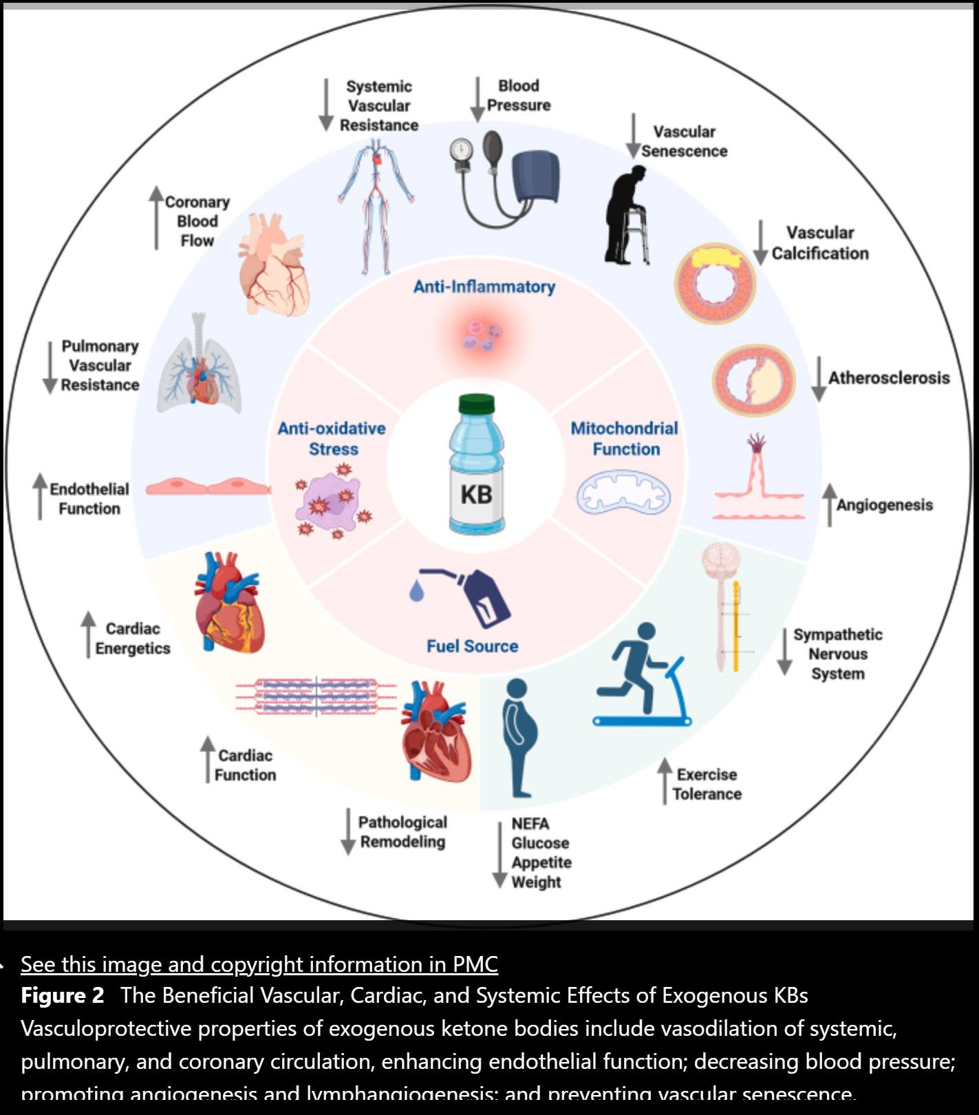 外源性酮体的血管保护作用包括扩张全身、肺循环和冠状动脉循环,增强内皮功能;降低血压;促进血管生成和淋巴管生成;防止血管衰老、钙化和动脉粥样硬化。KBs对心脏的影响包括改善心脏能量,改善病理性重构和增强心功能。KBs的全身代谢作用包括降低葡萄糖和非酯化脂肪酸(NEFA)水平,抑制食欲和体重减轻。KBs还可以提高运动耐受性,抑制交感神经系统。上述活动的细胞机制包括作为燃料来源、抗炎、抗氧化应激和线粒体功能的促进剂。