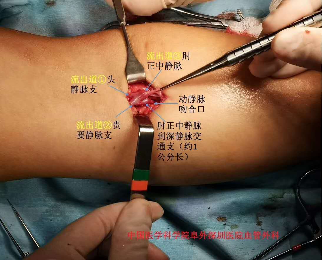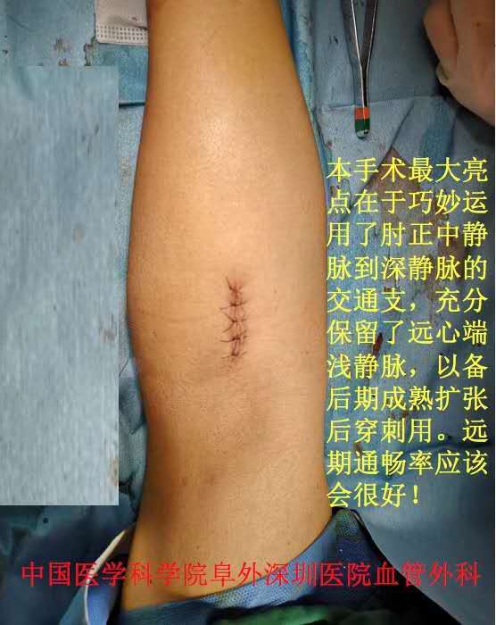 透析通路病例:中年男性,诊断:慢性肾功能不全尿毒症期,双上肢前臂血管质量很差(糖尿病13年),经过术前超声评估该患者适合做高位自体瘘,充分利用患者深、浅静脉交通支做瘘,好处在于吻合口上下静脉均可用于透析时穿刺。