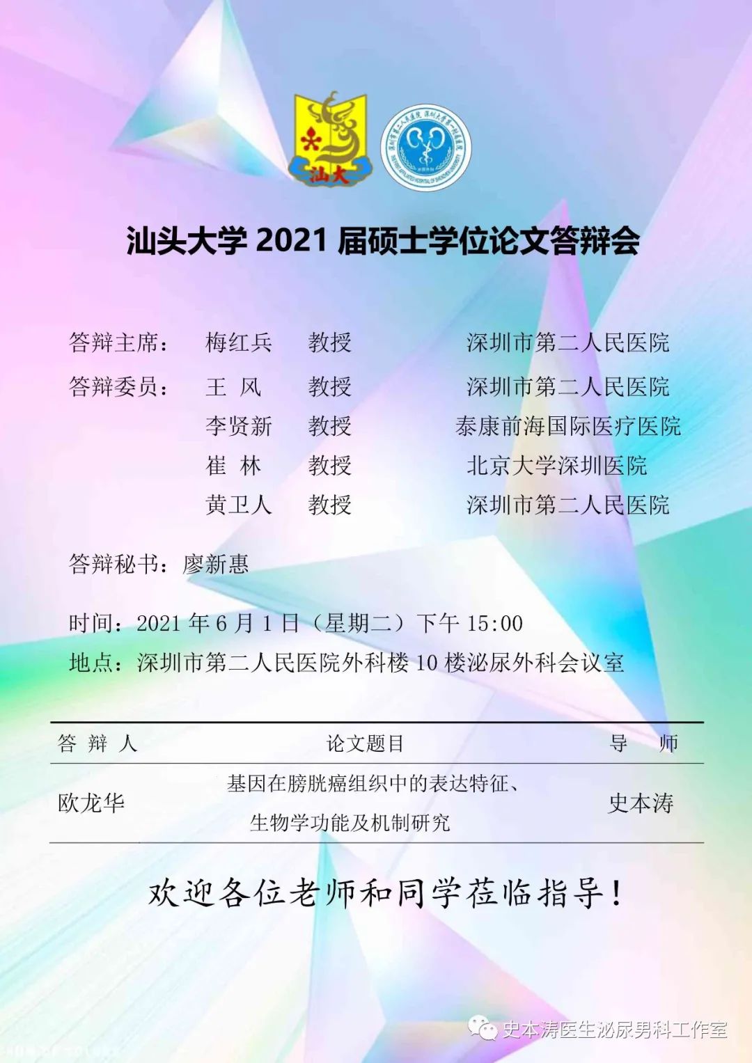 2021年6月1日下午3点,2021届汕头大学医学院泌尿外科硕士研究生毕业论文答辩会在深圳市第二人民医院(深圳大学第一附属医院)泌尿外科会议室举行。