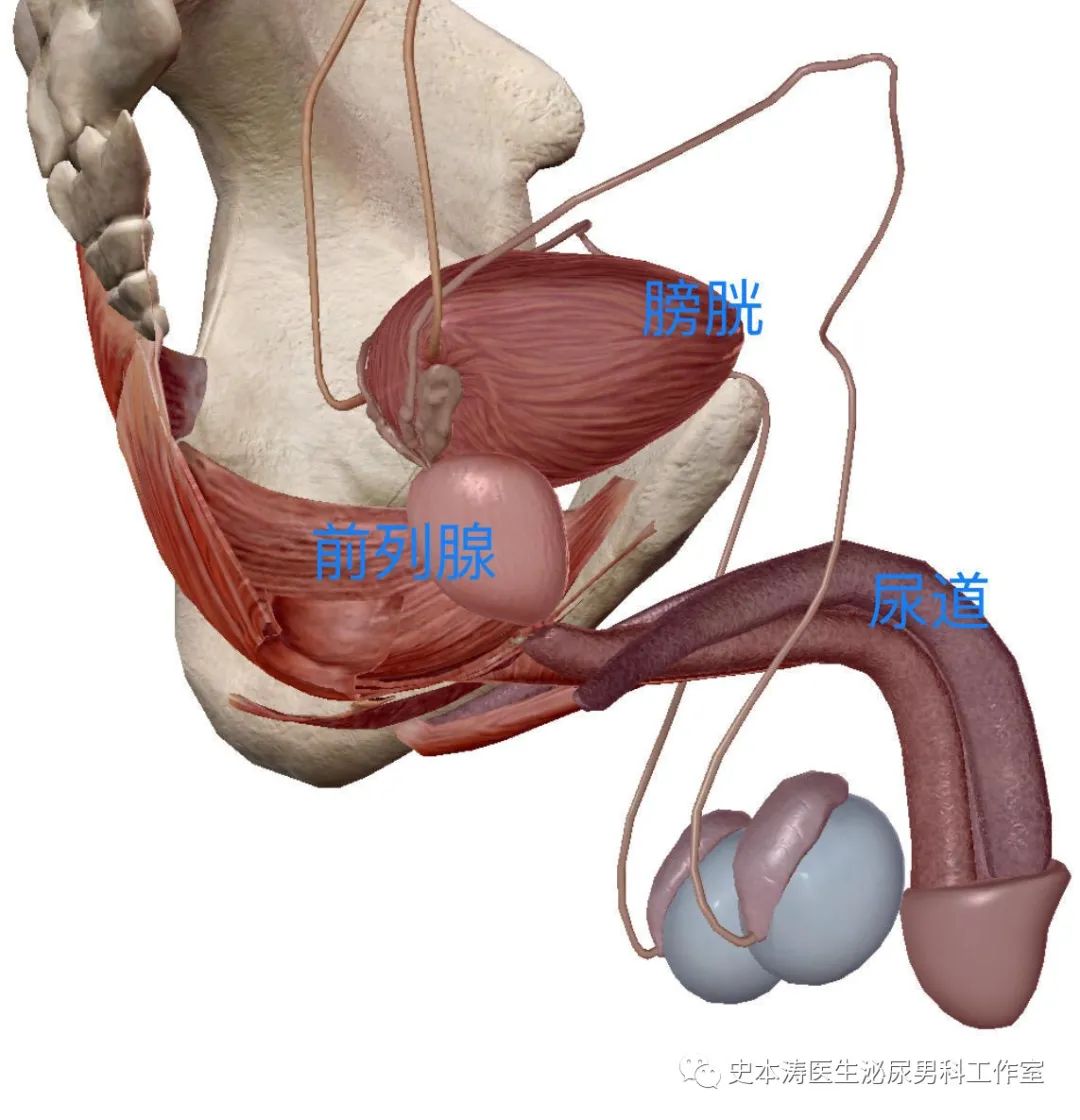 前列腺位于耻骨联合后,直肠前,尿生殖隔以上。前面窄而钝圆,后面较宽阔平坦,位于膀胱下方围绕尿道起始部。