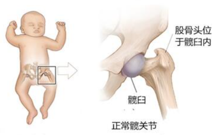 髋关节在解剖结构上是一个杵臼关节(图一),即一个窝(髋臼),窝里边一个球(股骨头),可以把髋臼类比为一只倒扣的碗,戴在股骨头的头上。DDH患儿,髋臼“窝”变浅,不能很好的包括并容纳股骨头的“球”,使得股骨头滑入滑出髋臼“窝”,从而引起半脱位、脱位(图二),或者“窝”非常浅平,即髋臼发育不良。