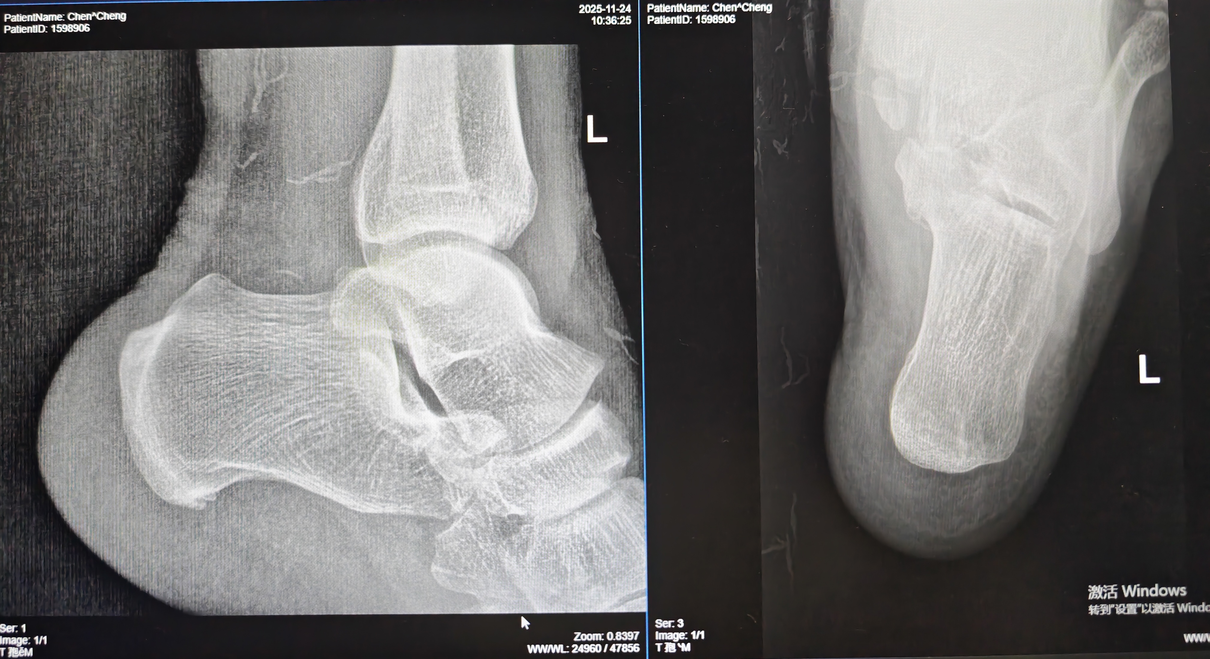 【影像】X线报左侧跟骨前下缘骨质增生。阅片见左侧距舟关节、跟骰关节对合不全,跟骨前下缘骨质增生,方向向前。