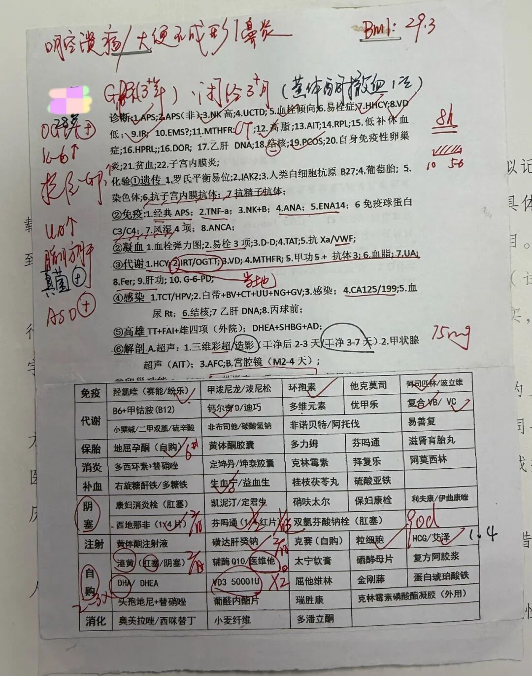 患者自身存在月经不规则、口腔溃疡、大便不成型及鼻炎等异常症状,全面检查后发现患者存在超重、胰岛素抵抗、多囊卵巢综合征、高脂血症、抗磷脂抗体综合征、NK细胞高、高同型半胱氨酸血症、维生素D低下、尿酸高及叶酸代谢异常(CT型)等代谢及免疫相关的异常。