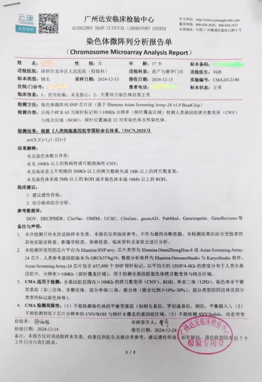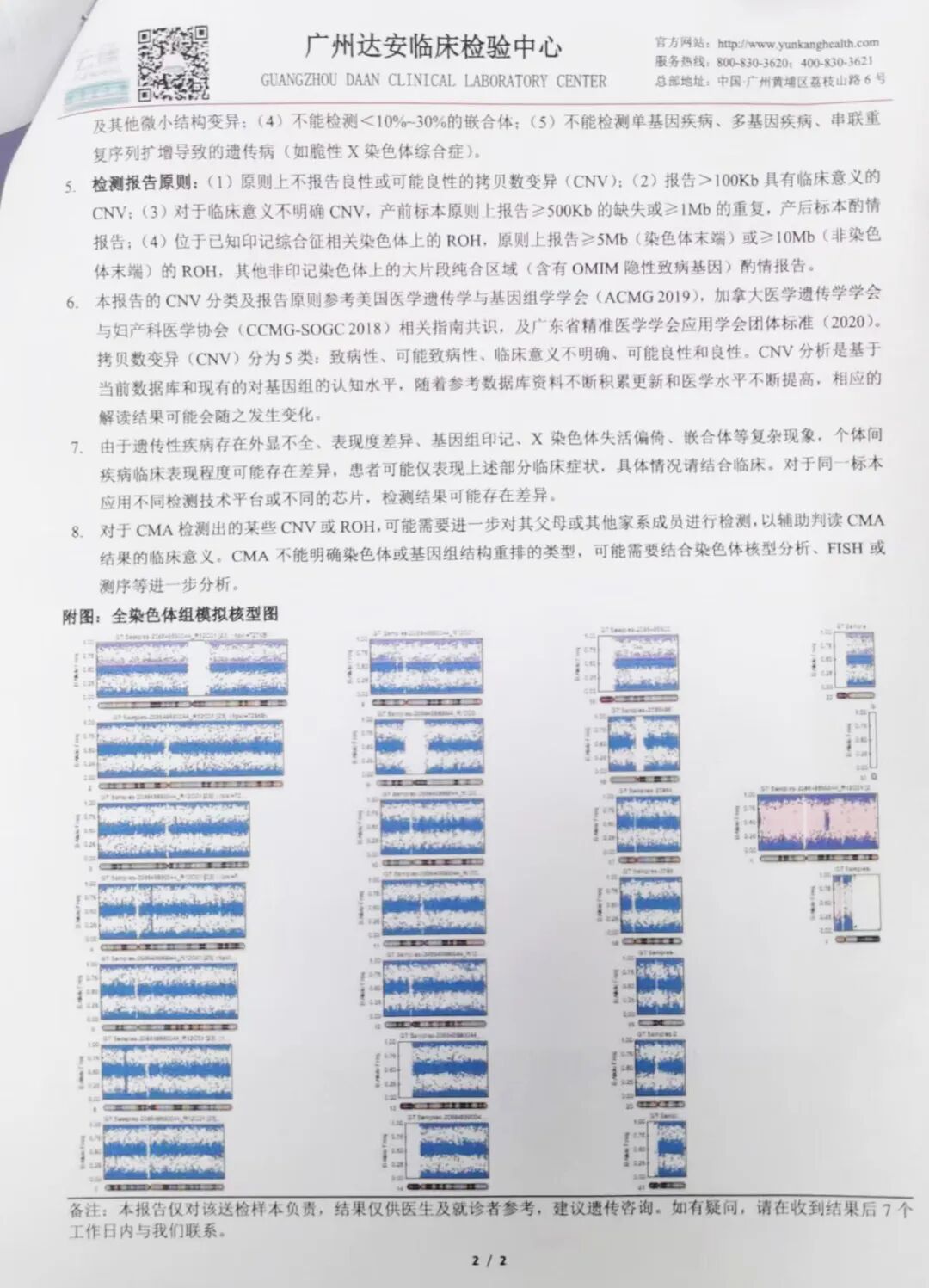 第一周期使用拮抗剂方案促排,获卵9枚,冻存囊胚3枚;移植2枚D3新鲜胚胎,着床后HCG翻倍不佳,自然流产,予清宫术,胚胎染色体CNV未见明显异常。