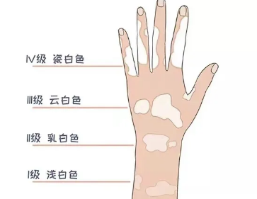 不同患者,白斑面积大小不一,在病情的轻重判断上,还可根据白斑颜色进行判断。因不同白斑色素脱失程度不同,所表现的白斑的颜色也不一样,由轻及重依次为:浅(淡)白色、乳白色、云白色、瓷白色。