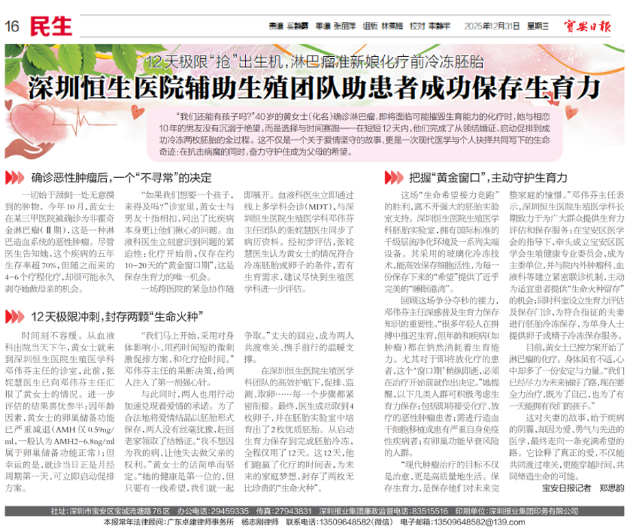 12天"抢"出生机,淋巴瘤准新娘化疗前冷冻胚胎。恒生生殖科团队助力生育力保存,留存“希望火种”